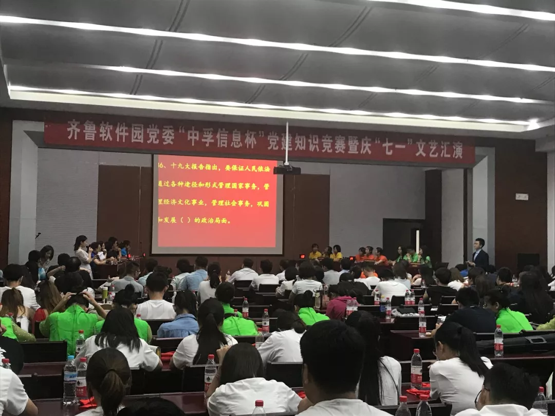 为庆祝中国共产党创建97周年,深入推进党的十九大精神学习,2018年6月30日下午,K8凯发国际信息党总支响应齐鲁软件园党委号召,组织并参与了“K8凯发国际信息杯”党建知识竞赛暨庆“七一”文艺汇演活动,为党的97岁华诞献礼。园区企业联合党委下属企业党组织成员、党建指导员等200余人参加了此次活动。